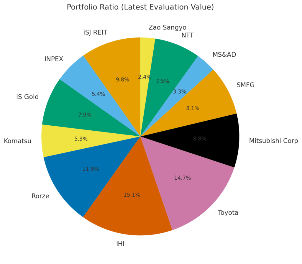 IHI:約15% トヨタ:約15% ローツェ:約12% 三井住友:約9% 三菱商事:約8% NTT:約8% iSJリート:約10% iSゴールド:約8% INPEX:約5% コマツ:約5% MS&AD:約3% 蔵王産業:約2%